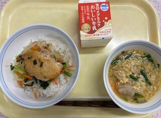 献立:キムたくごはん 牛乳 パリパリひじき 青菜のすまし汁