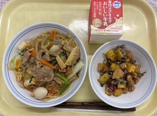 献立:あんかけやきそば 牛乳 大豆と小魚の変わり揚げ