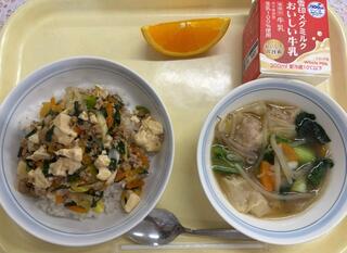 献立:四川豆腐丼 牛乳 ワンタンスープ オレンジ