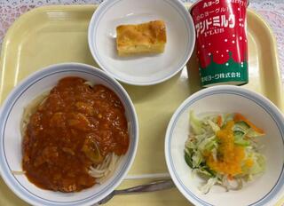 献立:スパゲティトマトソース 飲むヨーグルト にんじんドレッシングサラダ りんごのケーキ