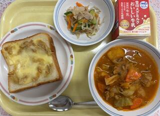 献立:ツナチーズトースト 牛乳 ボルシチ もやしのサラダ