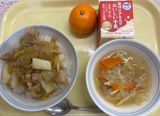 献立:豚キムチ丼 牛乳 わかめスープ くだもの