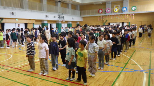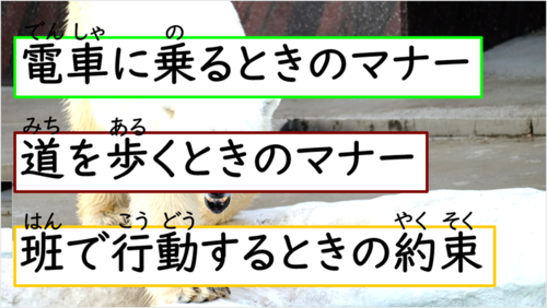 校長講話では、「電車に乗るときのマナー」「道を歩くときのマナー」「班で行動するときの約束」について話をしました。