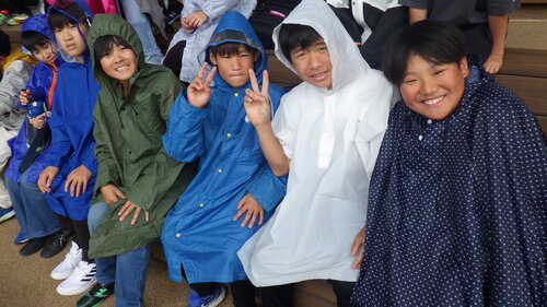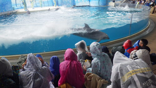 新江ノ島水族館では、イルカショーを前列の方で見る子が多く、イルカの歓迎のシャワーを受けてしまいました。(雨具で持ってきたカッパが効果を発揮しました。写真参照。)