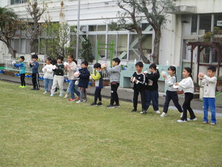 「風車を作って外で遊ぶから、見に来て!」と言われたので、校庭に行きました。「みんなで一緒にやってみよう」と自然に横一列になる姿や「風が吹く方に向けると、よく回るよ」と風の力に気付く姿があり、これはすっかり生活科の冬の遊びにも繋がっていました。こどもたちがとても楽しそうでした。(校長)