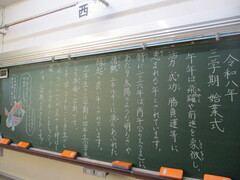 黒板にメッセージを書いて、こどもたちの登校を迎える様子が素敵ですね。(校長)