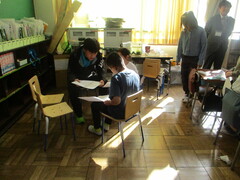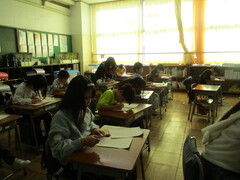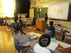 ALTが発音した形と色を聞き、ワークシートに色を塗っていました。みんな、正しく聞き取ることができていました。(校長)