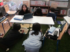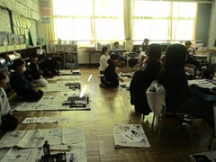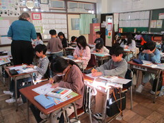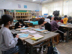 毛筆の学年は、自分で書きやすい場所を選んで書いていました。日頃から行っている「自分で学び方を選ぶ」取り組みが、書き初めでも実践されていました。(校長)