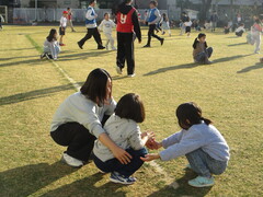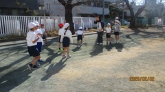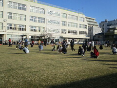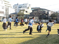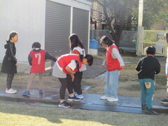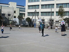 鬼は集会委員のこどもたちと先生方。捕まったら、捕まっていない2人が手をつなぎ、捕まった人を間にして「レンジでチン」と言えば、生き返ることができるゲーム。逃げるのに必死で、「レンジでチン」を行うのは、なかなか難しそうでしたが、楽しそうでした。大勢の先生方と一緒に遊べる貴重な時間にもなりました。