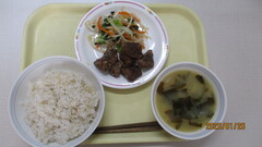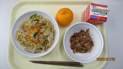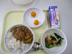 3学期最初のメニューは、「チキンカレーライス・のむヨーグルト、海藻サラダ、きんかん」です。今学期も、安心・安全な給食を提供します。(校長)