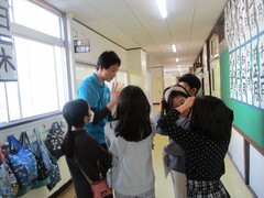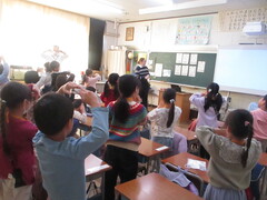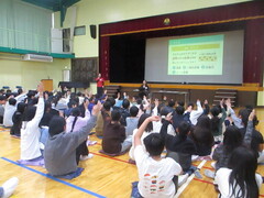 ALTの先生が英語で発音した形の名前を、手で作っています。みんなよく聞いていました。(校長)