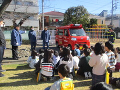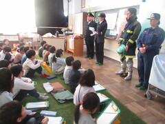 2学期に学習した「火さいから人々を守る」に関連して、蒲田消防団第四分団から6名の皆様に御来校いただき、消防団のお仕事についてお話していただきました。後半はポンプ車も見せていただきました。こどもたちが消防団の活動を身近に感じることができる学習になりました。(校長)