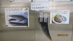 校長室前に掲示されているくじらのひげを見て、一年生は「このひげ、こわいね」などと言いながら、本日の献立に興味津々でした。食後にくじらの味を聞いてみると「おいしかったよ!」と答えていました。昔の給食をおいしくいただきました。(校長)