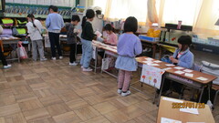 今日は単元の最後。みんなでお店屋さんごっこをしました。言葉遣いに気を付けたり、友達とのやりとりを楽しんだりしながら、活動できました。(校長)