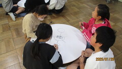 全校ミーティングに向けて、クラスのアイデアを考える作業をしていました。円いホワイトボード「エンタくん」は話合い活動に有効なグッズです。(校長)