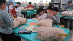 袋で作った形から、つくりたい「お友だち」にするために、どんな飾りをつけるか、考えていました。(校長)