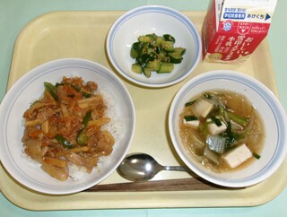 7月8日 火曜 いわしの蒲焼丼 きゅうりと白菜の梅あえ 呉汁