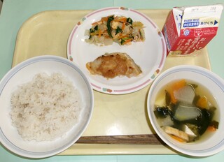6月12日 木曜 麦いりごはん たらの青のりあんかけ キャベツと人参のゆかりあえ ねりごまみそ汁