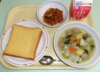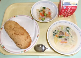 4月10日 木曜 黒糖パン 魚のグラタン 野菜スープ