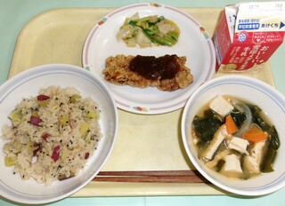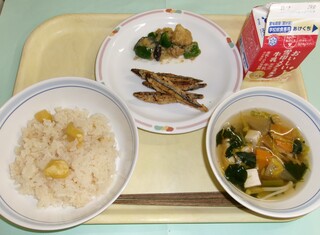 9月9日 火曜 栗ごはん きびなごのゆかり揚げ なすとピーマンのみそ炒め 菊花すまし汁