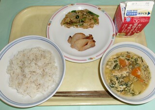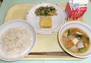 4月14日 月曜 麦いりごはん じゃこふりかけ ふくさ卵 豆豚汁 清美