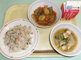 9月18日 木曜 鮭とわかめのまぜごはん いもたき 野菜の麦みそ汁