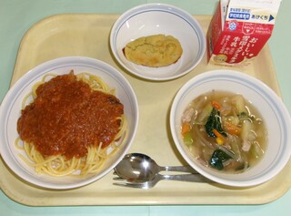 9月25日 木曜 ミートソーススパゲッティ 野菜スープ スイートポテト