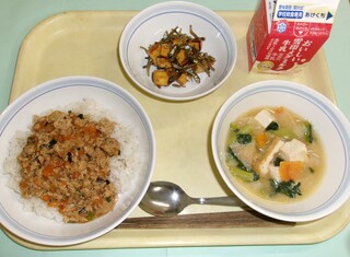 9月29日 月曜 きのこのそぼろ丼 煮干しとさつまいもの甘辛揚げ ねりごまみそ汁