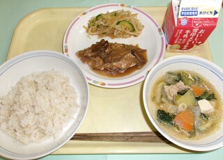 6月24日 火曜 しょうがめし いわしの照り焼き すろっぽ 絹さやのみそ汁