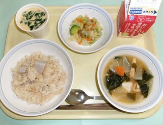 10月2日 木曜 里いもごはん 茶わん蒸し キャベツのツナあえ わかめのみそ汁