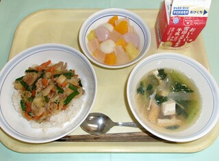 10月3日 金曜 スタミナ丼 すまし汁 紅白白玉のフルーツポンチ