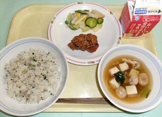 10月9日 木曜 じゃことわかめの混ぜごはん とりのから揚げ 3色のさっぱりサラダ お吸い物