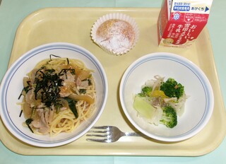 10月10日 金曜 和風スパゲッティ ブロッコリーとベーコンのサラダ キャロットケーキ