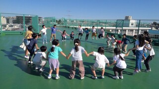 国語「くじらぐも」の物語が、こどもたちは大好きです。天気の良い日に、屋上で「天まで届け、一、二、三。」と、ジャンプしてみました。「本当にくじらぐもに乗った気持ちだよ。」と、大喜びなこどもたちが、微笑ましかったです。
