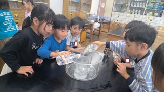 算数の「どちらがおおい」では、実際に水を使って試すことで、様々な比べ方のよさを実感しながら学ぶことができました。初めて理科室で学習したため、気分は実験!大盛り上がりなこどもたちでした。