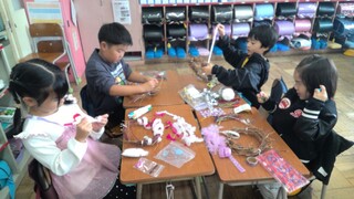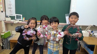 生活科で大切に育ててきたアサガオのつるを使ってリースを作りました。お気に入りの飾りをつけて、すてきなリースができました。