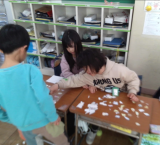 こどもたちが、グループになり話し合いながらお店屋さんの準備をすることができました。4組では、「お寿司屋さん」や「文房具屋さん」などの意見が出ました。グループごとに、「私は、○○を作るね!」「じゃあ、○○を作っておくよ。」など、話し合いながら活動を進める姿に成長を感じました。どのお店も盛況で、楽しみながら学習をすることができました。