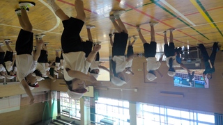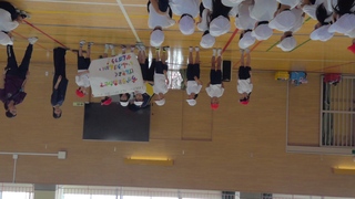 体育館の体育では、マット遊びを楽しんでいます。一人で転がるのも楽しいですが、友達と息を合わせて体を動かすと、さらに楽しくなります。