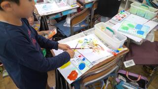 画用紙に白いクレパスで絵を描いた後、水をたっぷりのせ、その上に絵の具を垂らしてにじみを作りました。こどもたちは、じわっと色が広がっていく様子を楽しんでいました。筆をたたいて絵の具を飛ばすと、きれいなまだら模様が出来上がりました。作品が完成するのが楽しみです。