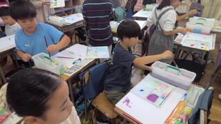 3年生の教室前には、アゲハチョウの幼虫やヤゴ、トカゲと、たくさんの生き物がいます。こどもたちは興味津々で、毎日、飼育ケースをのぞき込んで観察しています。アゲハチョウはすでに3匹の羽化に成功し、きれいなチョウに育ったことを喜んでいました。キャベツの葉には、モンシロチョウの卵が見つかりました。どの生き物も、これからの成長が楽しみです。
