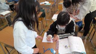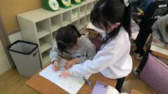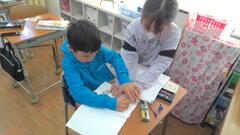 かくのが難しい友達には、ミニ先生がこつを教えてくれました。
