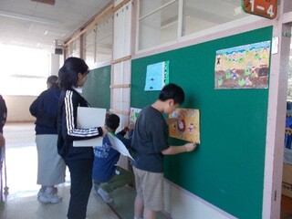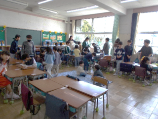 入学式の次の日から、朝、1年生の教室にお手伝いに行っています。始めはランドセルや道具箱の準備、手さげを置く場所、名札の付け方に戸惑っていた1年生が、数日のうちに、自分たちでできるようになりました。4月中旬には、朝の支度が終わった後に、じゃんけんをしたり、トランプをしたりして、1年生と6年生が楽しく交流しています。4月の最後の週には、6年生に会いたくて、休み時間に6年生の教室を訪れる1年生が現れました。これからも、さらに仲良くなって、楽しい時間を過ごしていってほしいです。