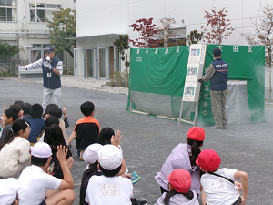11月6日第一校庭で4年生が煙体験を行いました。火災時の避難の仕方をわかりやすく教えていただいたあと、いざ体験。