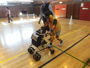 後半は2クラスごとに体験です。からだに重りや腰が曲がる装具、目が見えにくくなるゴーグルなどをつけて歩いたり、字を書いたりしました。杖や歩行器を使うことで少し歩きやすくなることを感じた一方、「階段は苦労しそう」「タイヤが進まないところはどうするのだろう」など、体験を通してよりさまざま思いや疑問をもつことができました。