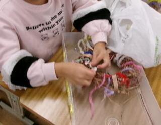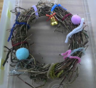 一生懸命お世話をしたあさがおとの思い出を大切に残すため、あさがおのつるを使ってリース作りを行いました。(1)友達と協力して、支柱に絡みついたあさがおのつるをすべて取りはずす。(2)リースの形につるを丸める。(3)モールでつるを固定する。(4)飾り付けをする。どの作業も大変でしたが、楽しく取り組むことができました。完成した作品は、順次持ち帰りますので、ぜひ大切に飾っていただければと思います。