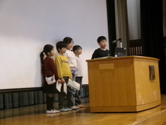 終業式に、2年生の代表児童が、2学期にがんばったことと3学期にがんばりたいことを、全校の前で発表しました。