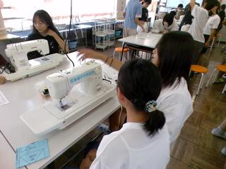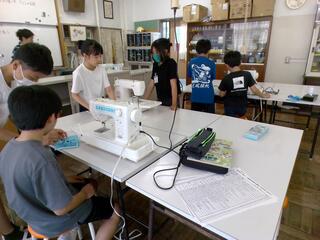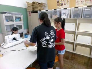 6年生のおかげで、5年生が1人で糸掛けを行い、ミシンを使えるようになりました。