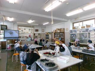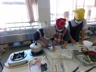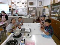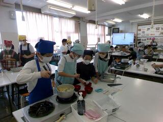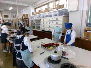 調理実習をしました。煮干しで出汁をとって、みそ汁を作りました。だしのとりかたや、野菜の切り方を学びました。いちょう切り、たんざく切り、小口切りなどいろいろな切り方で野菜を切り、火の加減を調節しながら作りました。 だんだんと出汁のいい香りが家庭科室いっぱいに広がってきました。よくしみた大根とねぎと油揚げの美味しいお味噌汁ができました。次回は、ごはんと味噌汁作りです。それまでに、お家で作ってみられるといいですね。