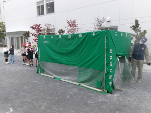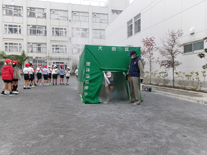 11月6日第一校庭で4年生が煙体験を行いました。火災時の避難の仕方をわかりやすく教えていただいたあと、いざ体験。