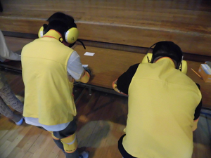 後半は2クラスごとに体験です。からだに重りや腰が曲がる装具、目が見えにくくなるゴーグルなどをつけて歩いたり、字を書いたりしました。杖や歩行器を使うことで少し歩きやすくなることを感じた一方、「階段は苦労しそう」「タイヤが進まないところはどうするのだろう」など、体験を通してよりさまざま思いや疑問をもつことができました。